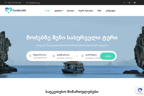 საიტის აღწერა: მოგზაურობა არ არის დამოკიდებული მხოლოდ შესაძლებლობაზე, მთავარია გქონდეთ სურვილი’’- სწორედ ამ იდეის გარშემო შემოიკრიბა ჩვენი გუნდი. turebi.info-ს მომხმარებელს სთავაზობს ტურ- პაკეტებს მსოფლიოს ნებისმიერი მიმართულებით, მორგებულს თქვენ ბიუჯეტთანდა ინტერესებთან